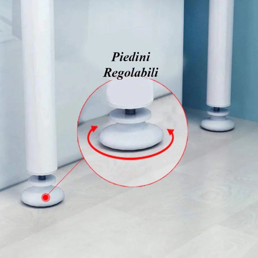 - Questo scaffale è realizzato in robusto telaio di metallo verniciato in bianco con la vernice a polvere dotato di pratico rialzo ideale per gli oggetti piu’ alti , 3 comodi ripiani , un portacarta igienica laterale e due ganci portasciugamani laterali. Maggiore stabilità grazie agli elementi di sostegno ed ai pratici gommini antiscivolo. Resistente ai processi di ossidazione. Puo’ essere posizionato sul WC o sopra la lavatrice. Prodotto in Turchia.